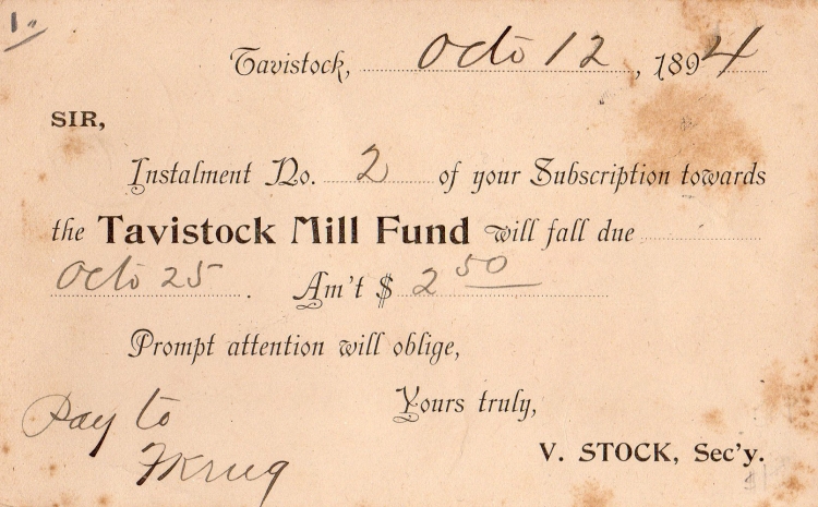 This is a typical Postal Card: it is to John Lemp from Valentine Stock reminding him that his next installment to the Tavistock Mill Fund is due. .