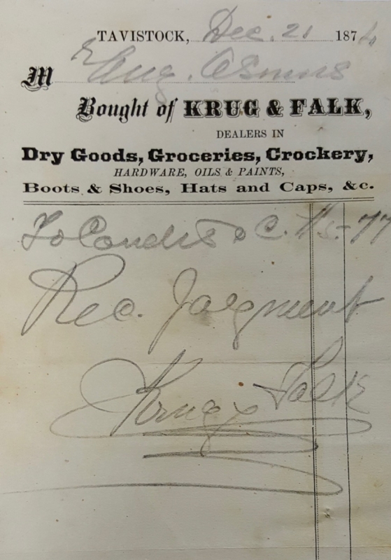 One of the more delightful elements of our collection are the many receipts issued by Tavistock and area businesses over the years. This one, from Krug & Falk, speaks to the days of the general store. You really could buy everything you needed at a general store. This one, operated in partnership by Fred Krug and Adam Falk, was located at the five corners where Home Hardware stands today. This receipt, dated 1874, recorded a purchase made by August Asmus who we know was the local tailor. Mr. Asmus was also a noteworthy figure at Trinity Lutheran Church in Sebastopol and in 1874 was serving as the Church Secretary.