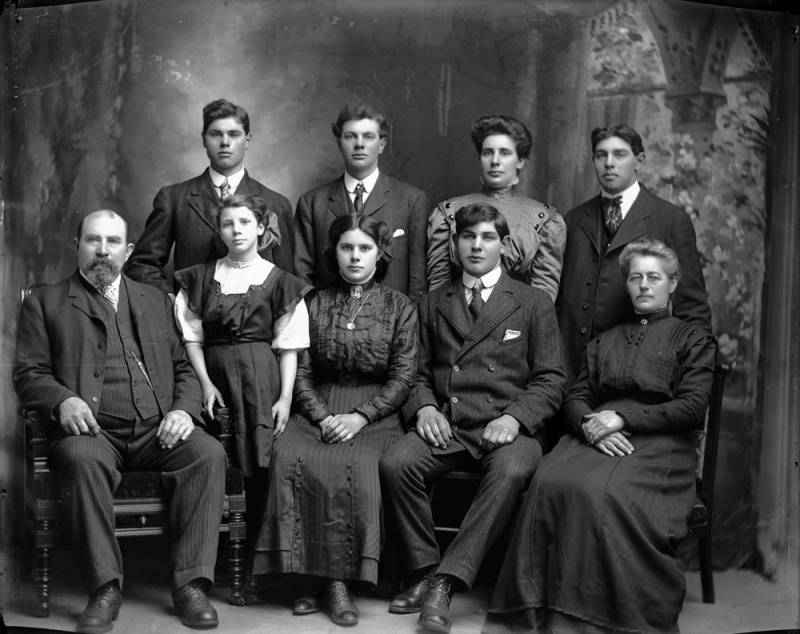Scan0056CategoryFamilyThe family includes, left to right, seated: Conrad, Frieda (Mrs. Hendery), Martha (Mrs. Fred Sayers), Herman, Mary (Youngblut); standing: Ezra, Carl, Laura (Mrs. John Berlet), and William.